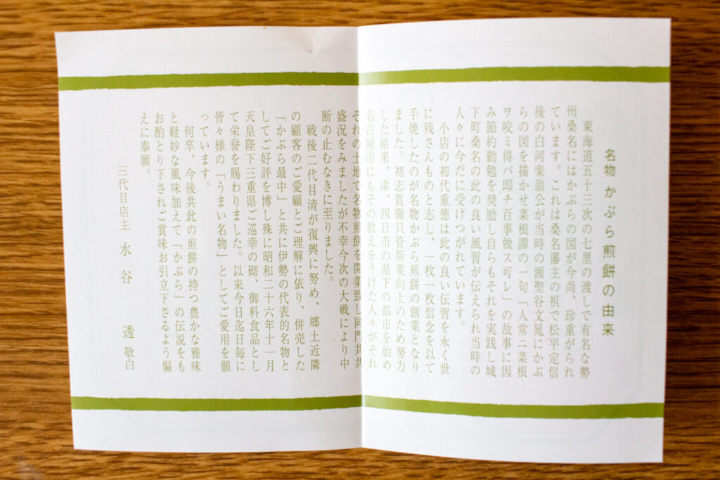 桑名の石取祭を観に訪れた翌日、城下町の面影が残る南寺町を歩いていると、どこか懐かしい佇まいのお店に惹かれて足を止めました。見るからに老舗な「かぶら煎餅本舗」さん。入口には「かぶらせんべい」の文字が掲げられていました。恥ずかしながら、私はこのとき初めて「かぶらせんべい」の存在を知りました。「桑名名物」「老舗」と聞けば、一度試さずにはいられません。