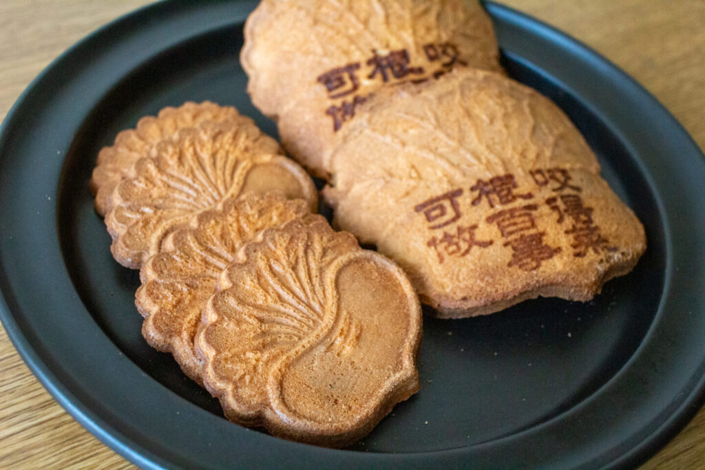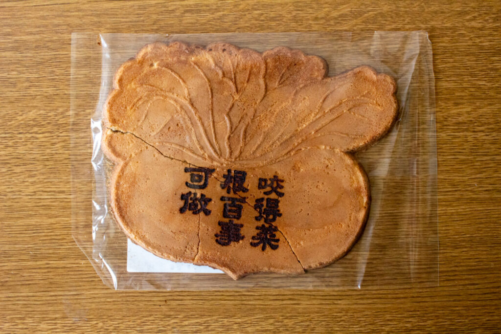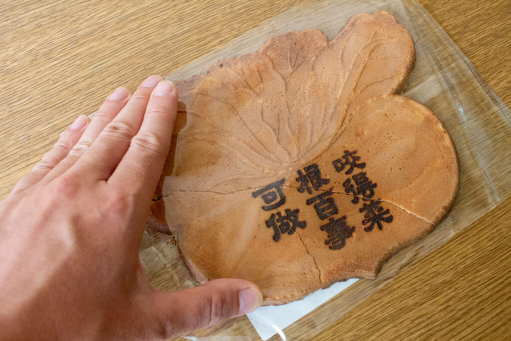 名前の通り、「かぶらせんべい」の「かぶら」は野菜のカブのこと。実は江戸時代の桑名藩主・松平定信の質素倹約の教えが関係しています。中国の古典「菜根譚(さいこんたん)」は、「人はかぶらの根のように、苦みを耐えて飲み込めれば、どんな困難も乗り越えられる」という教えに、松平定信は大変感銘を受けたとされています。そして、カブ(かぶら)の形を模した煎餅に漢文を焼き印させて家臣たちに配り、教えを広めたそうです。