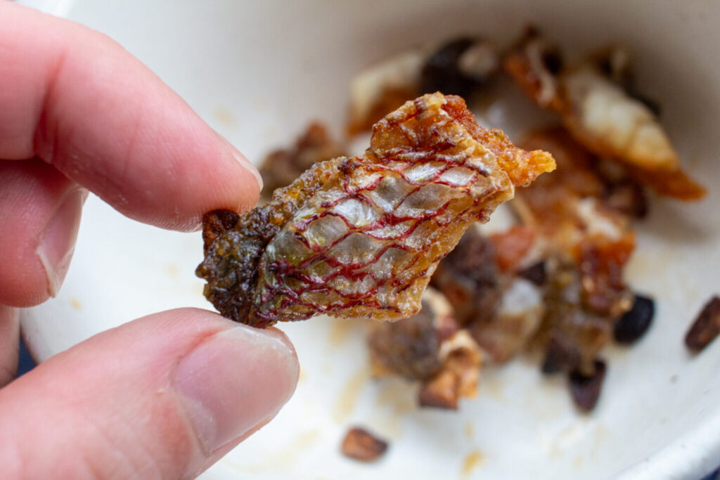 【皮チップス】剥がした刺し身の皮をオリーブオイル×にんにくでパリッと仕上げました。