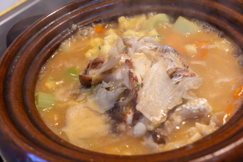 【アラ汁(味噌仕立て・鯛のつみれ入り)】頬肉や目の周りも美味しくいただく