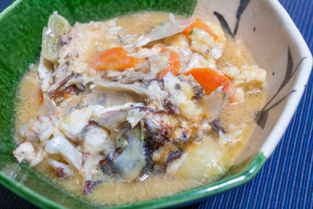 頭とアラは、塩だけだと物足りない気がして味噌仕立てに。ここで光るのが、目の周り・頬肉。骨以外はほとんどいただける煮込み料理は、魚を食べ尽くせます。骨を選り分けながら身を探す探索感も、食べていて楽しい。人参など野菜も入れて、アラ汁というより真鯛の荒鍋に近い満足感でした。