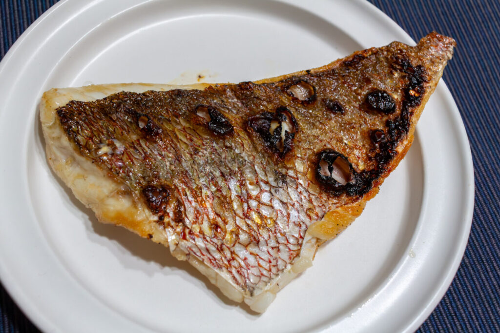 フィレの一部は塩を振ってキッチンペーパーで包み、ジップ袋で寝かせました。「一晩寝かせる」工程が、翌日の楽しみを作ってくれます。翌日はグリルで塩焼きに。焼けた皮目は香ばしく、じゅわっと旨味が溢れて、ホクホクとした身が絶品でした。