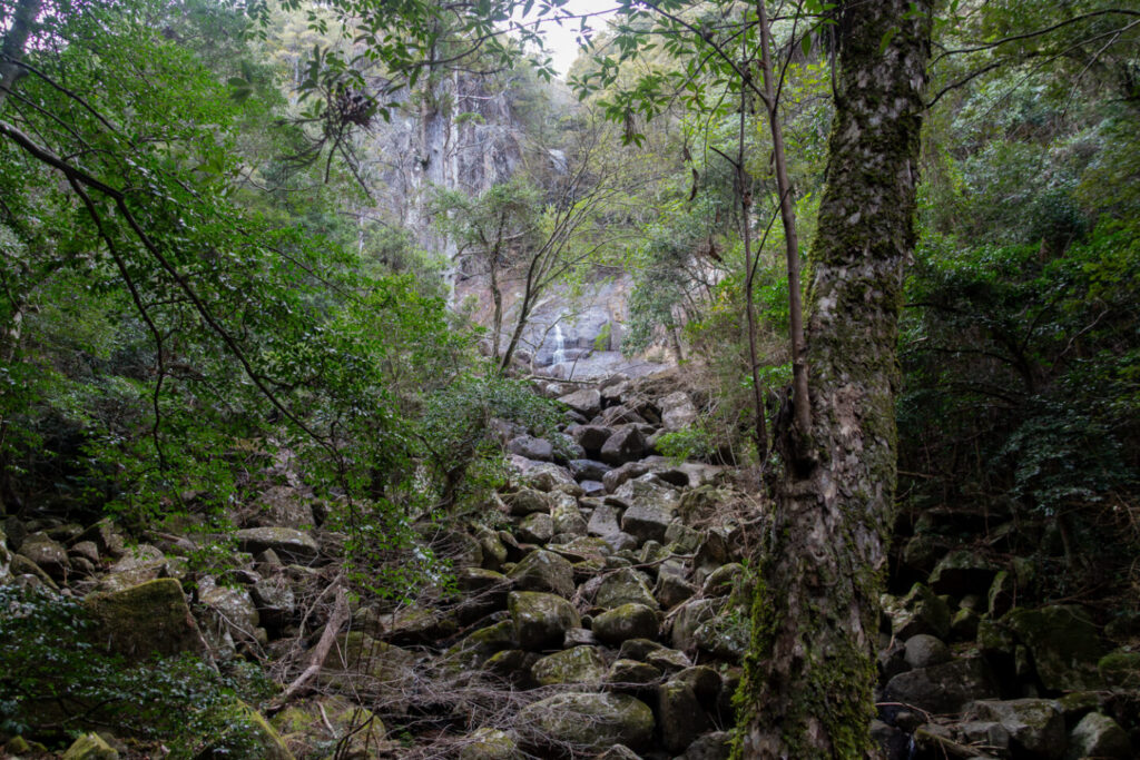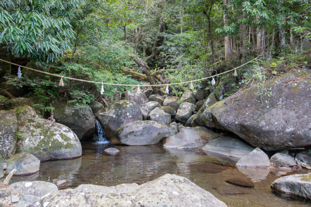 自然そのものが御神域。巨木と水、そして見上げる先にある滝の存在感