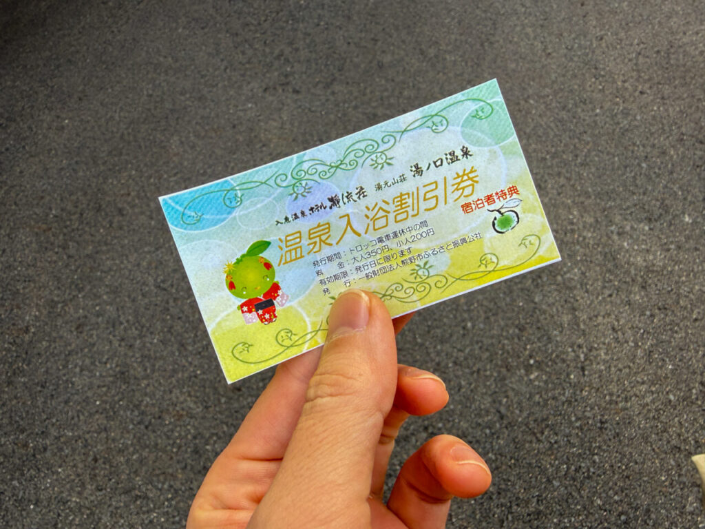 瀞流荘に泊まると、湯ノ口温泉の割引券がもらえてタオルなしで350円。正直「え、いいの…?」と思うレベルのありがたさでした(なので罪滅ぼしに売店で買い物しました)。