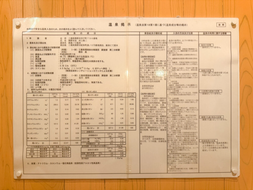 湯ノ口温泉の源泉は、公式にはナトリウム・カルシウム塩化物泉。湧出量も多く、泉温は約44.7℃とされています。